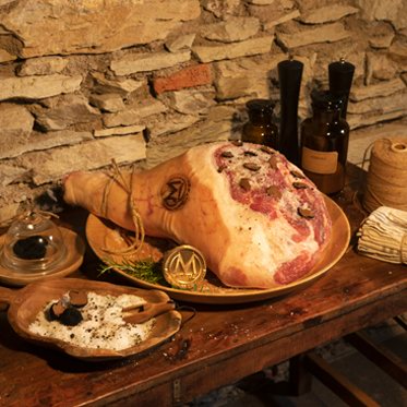 Selezionate cosce di filiera di origine Italiana, massaggiate a mano con cura con una concia naturale di sale marino, erbe di montagna e acqua fresca e pura di Lurisia, stagionate in fresche cantine rocciose, in pineta, per almeno 16 mesi.